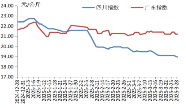 本周,廣東地區(qū)豬肉周均價為每公斤21.28元,環(huán)比下跌0.4%,同比下跌1.1%,結(jié)束了同比上漲趨勢。周前期,生豬供應(yīng)較為平穩(wěn),屠宰企業(yè)按需收購,生豬及豬肉價格以穩(wěn)定為主;周中期,散養(yǎng)戶和規(guī)模養(yǎng)殖場出欄節(jié)奏放慢,生豬及豬肉供應(yīng)短時收緊,支撐豬肉價格小幅反彈;周后期,周邊市場豬肉價格下跌,本地區(qū)經(jīng)銷商和消費者壓價采購,屠宰企業(yè)為保證銷量降低售價??傮w看,廣東地區(qū)豬肉周均價環(huán)比微跌。