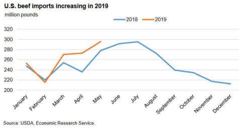 根據(jù)USDA最新預(yù)測(cè),明年美國牛肉和豬肉進(jìn)口量會(huì)減少,羊肉進(jìn)口量保持不變,大洋洲由于天氣原因存欄減少,牛肉供應(yīng)量持續(xù)減少,預(yù)計(jì)美國牛肉進(jìn)口量會(huì)減少3%,由于中國市場(chǎng)非洲豬瘟導(dǎo)致的高需求,以及全球豬肉供應(yīng)減少,美國豬肉進(jìn)口量預(yù)計(jì)會(huì)減少4%,美國國內(nèi)牛肉和豬肉產(chǎn)量分別會(huì)提高1.1%和2.8%,也減少了對(duì)進(jìn)口肉的需求。2019年美國牛肉進(jìn)口量增加,五月進(jìn)口量達(dá)到2.96億磅,同比增加6%,除了新西蘭外其他國家對(duì)美國出口量都增加,其中澳洲前五個(gè)月出口量同比增加14%,主要因?yàn)榻衲晟习肽臧闹尥涝琢吭黾印?span>