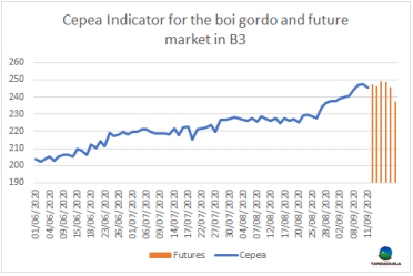 巴西主要出口州育成牛平均價(jià)格自六月初價(jià)格開始上漲以來上漲了30%。受供應(yīng)短缺和出口需求尤其是中國市場需求強(qiáng)勁的影響,與去年九月中相比,上漲接近60%。本周巴西主要出口州育成牛價(jià)格上漲至237雷亞爾/15公斤,30天付款,免運(yùn)費(fèi)。期貨市場參考價(jià)Cepea育成牛價(jià)格指數(shù)為245.65雷亞爾/15公斤。較本周中間幾天247雷亞爾/15公斤的最高價(jià)有輕微下降。略低的價(jià)格影響育成牛期貨價(jià)格輕微下行。預(yù)計(jì)當(dāng)前的價(jià)格將保持堅(jiān)挺,因?yàn)槭袌鋈允侨灰怨?yīng)端為主導(dǎo)。但價(jià)格的上行趨勢將結(jié)束。11月和12月價(jià)格預(yù)計(jì)將達(dá)250雷亞爾/15公斤,到2021年五月價(jià)格將達(dá)237雷亞爾/15公斤。
