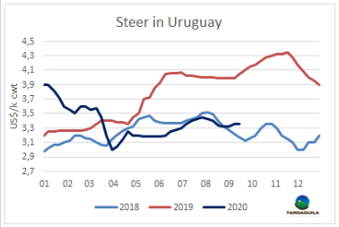 本周南方共同市場閹牛價(jià)格指數(shù)連續(xù)第三周上漲,上漲至2.97美元/公斤。前面三周隨著巴西價(jià)格上漲,南方共同市場閹牛指數(shù)上漲了38美分,上漲了15%。上漲的主要因素仍是巴西,巴西按雷亞爾計(jì)主要出口州育成牛平均價(jià)格上漲了8.4%,上漲至237.1雷亞爾/15公斤,同時(shí)雷亞爾升值了5.9%。巴拉圭是另一個(gè)牛價(jià)上漲的國家,過去三周待宰牛價(jià)格上漲了38美分,上漲至2.68美元/公斤。南美地區(qū)最低價(jià)(巴拉圭)和最高價(jià)(烏拉圭)的差距從三周前的1.02美元縮減至目前的0.68美元。阿根廷和烏拉圭牛價(jià)大體穩(wěn)定,參考價(jià)分別在2.83美元/公斤(含9%的出口稅)和3.36美元/公斤。