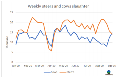 上周母牛屠宰量增長,盡管被閹牛和小母牛屠宰量的下降所抵消,烏拉圭活牛屠宰量仍有輕度上漲。烏拉圭肉協(xié)報(bào)道,截止九月12日的一周內(nèi),牛屠宰量33374頭,較上周上漲了0.5%,增加了167頭,同比去年同一周,屠宰量下降了6520頭,約16%。母牛屠宰量顯著增長,達(dá)14727頭,增長了18.6%,達(dá)六月第一周以來最大母牛屠宰量。相反,閹牛屠宰量下降了10.3%,下降至14172頭,小母牛屠宰量4156頭,下降了14.5%。自四月末起20周以來母牛屠宰量首次超過閹牛屠宰量。屠宰量最高的工廠是Athena-Pulsa(3680頭)Las Piedras(3524頭)Marfrig-Colonia(3503頭)。Marfrig三家工廠屠宰總量9060頭,美麗華Carrasco廠重新開始屠宰,屠宰總量達(dá)6080頭。九月截至目前牛屠宰量60886頭,較去年同期下降了1萬頭,下降了14.1%。