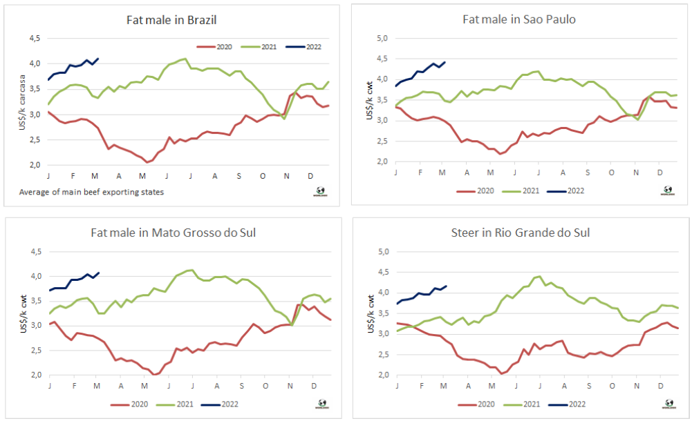 本周南方共同市場閹牛價(jià)格指數(shù)繼續(xù)8美分至4.36美元/公斤,創(chuàng)新紀(jì)錄。巴西烏拉圭阿根廷牛價(jià)均上漲,巴西育肥牛平均價(jià)格上漲主要原因是匯率走強(qiáng)和本地雷亞爾價(jià)格同步上漲,美金牛價(jià)較上周上漲了10美分至4.1美元/公斤。阿根廷和烏拉圭牛價(jià)達(dá)南美地區(qū)最高,也是歷史最高價(jià)格,本周出口閹牛參考價(jià)接近5.1美元/公斤,巴拉圭方面牛價(jià)趨勢相反,西方對俄羅斯的制裁限制了向這個(gè)國家銷售的可能性,巴拉圭受到了強(qiáng)烈的沖擊。