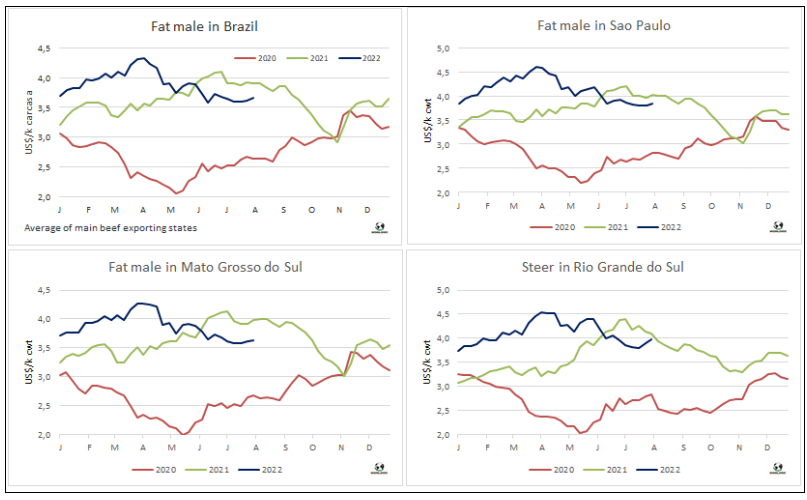 巴西工廠活牛預(yù)定時(shí)間拉長,育肥牛市場(chǎng)成交仍然慘淡。主要交易市場(chǎng)價(jià)格保持穩(wěn)定,圣保羅和南馬托格羅索州價(jià)格略有下跌。圣保羅州育肥牛成交價(jià)下跌了2雷亞爾/15公斤至303.5雷亞爾/15公斤,免稅,30天付款。賣到中國市場(chǎng)的4顆齒以上的牛價(jià)格比賣到國內(nèi)市場(chǎng)的牛相比價(jià)格極高。國內(nèi)市場(chǎng)需求仍然很淡,盡管月初的時(shí)候市場(chǎng)通常會(huì)有所回暖,批發(fā)市場(chǎng)牛肉價(jià)格有所上漲,尤其是前部位肉價(jià)格。分析師認(rèn)為八月底九月初在兩個(gè)生產(chǎn)周期之間供應(yīng)將出現(xiàn)短缺。
