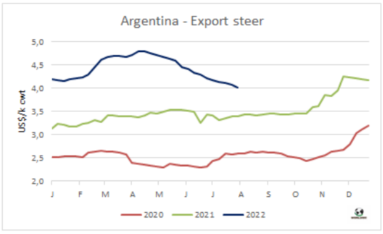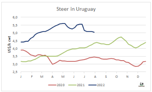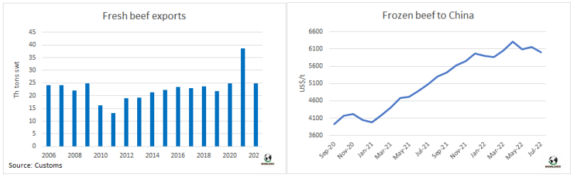 在牛肉出口量上可以感受到屠宰量的劇烈減少。據(jù)海關(guān)發(fā)布的數(shù)據(jù),七月烏拉圭牛肉出口量24863噸,達(dá)2020年八月至今兩年以來最低水平,平均出口離岸價(jià)7144美元/噸,環(huán)比下降了1.2%。中國仍是主要出口目的地,盡管對(duì)中國出口量較此前幾個(gè)月略有下降。平均每出口三噸牛肉其中兩噸出口到中國(65%),今年一月和三月對(duì)中國牛肉出口量占比曾達(dá)到72%。對(duì)中國出口的均價(jià)開始下跌。冷凍去骨牛肉平均出口價(jià)格為6504美元/噸,比6月份下跌了118美元,比4月的最高點(diǎn)下跌了275美元(4%)。冷凍帶骨牛肉平均價(jià)格較上月下降了264美元(5.5%)至4523美元/噸。今年前7個(gè)月,烏拉圭出口牛肉出口量累計(jì)23.8萬噸,平均出口價(jià)格7002美元/噸,出口量同比增長了5.5%,平均價(jià)格同比增長了29%。