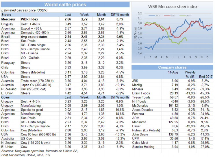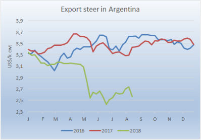 美國和土耳其的政治危機嚴重影響到了新興國家的貨幣,南方共同市場各國也受到了影響,本地閹牛均價被拉低。本周南方共同市場閹牛指數(shù)降低了6美分到2.66美金/公斤,近四周最低。前期由于本地牛價上漲以及貨幣貶值趨緩,美金牛價逐漸恢復,此趨勢被打破,阿根廷比索對美元貶值8.2%,巴西雷亞爾貶值3.6%。巴西本地育肥牛價漲到137.1雷亞爾,漲幅0.8雷亞爾,但換算成美元降低了7美分到2.34美金,阿根廷情況也一樣,出口閹牛價格漲了1比索,但由于貨幣貶值,美金價減少了17美分至2.57美金。烏拉圭牛價也顯示出降低趨勢,因為猶太團隊即將撤離,開始為481配額準備牛肉生產(chǎn)。本地區(qū)只有巴拉圭一個國家牛價上漲,漲了5美分。