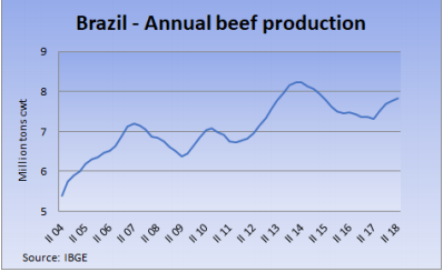 2018年第二季度,巴西總共屠宰了769萬頭牛,比上一季度減少0.4%,但同比增加了3.6%。第一季度牛肉總產(chǎn)量達到189萬噸,比上一季度增加0.5%,因為平均屠宰重量增加了。