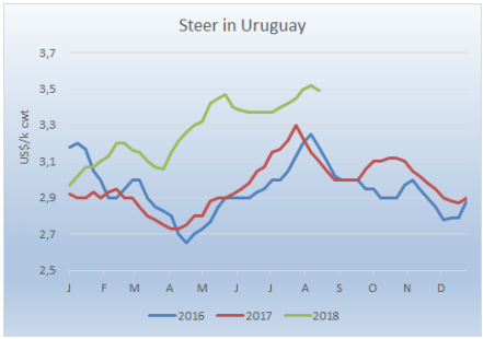 今年進口牛肉的演變很令人吃驚,不管在肉店還是超市,都很容易買到巴西進口的三角肉或其他部位牛肉,比烏拉圭價格低。截止到2018年8月,海關(guān)數(shù)據(jù)顯示一共進口了8767噸牛肉,其中84%冷鮮牛肉主要直接去到零售市場,16%冷凍牛肉主要去工業(yè)生產(chǎn)。進口量一直在增長,7月達到1620噸,月度最高記錄,8月前8天達到450噸,如果保持這個節(jié)奏,8月進口量會超過1700噸。進口量的增長主要是烏拉圭活牛價格比周邊國家高導致的,烏拉圭特種閹牛本周價格達到3.5美金/噸,而巴西價格才2.4美金,差價達到40%使巴西牛肉非常有競爭力。而烏拉圭生產(chǎn)成本過高也使巴拉圭牛肉更有競爭力,雖然巴拉圭牛價和烏拉圭差不太多(3.15美金)。此外烏拉圭缺牛會進一步提高牛價。