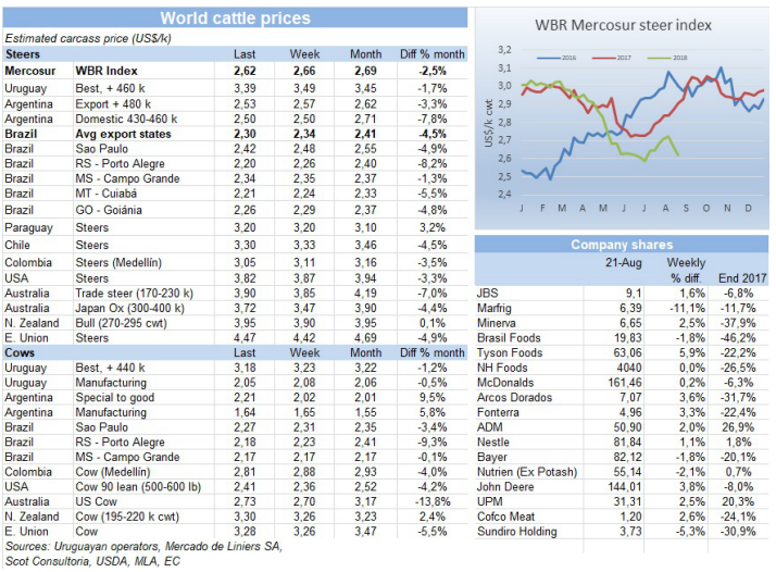 當(dāng)?shù)刎泿抛呷醭掷m(xù)影響活牛價格,以本地貨幣成交活牛的國家競爭力增強,南美共同市場閹牛指數(shù)本周又下跌了4美分到2.62美金/公斤,7月初以來最低。巴西雷亞爾對美金貶值了2.4%,阿根廷比索對美金貶值了1.2%,所以兩國美金牛價都下跌了4美分,巴西2.3美金/公斤,阿根廷2.53美金/公斤,烏拉圭市場形勢有所改變,猶太市場暫停,專注于481配額的谷飼牛肉生產(chǎn),巴拉圭牛價和上周一樣沒有變化。