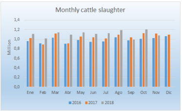 烏拉圭活牛屠宰量今年將超過236萬(wàn)頭,比2017年略有增加,這是連續(xù)第五年屠宰量增加,其中48%是閹牛,50%是母牛和小母牛,閹牛均重514公斤,母牛458公斤,小母牛408公斤。羊的屠宰量達(dá)到98萬(wàn)頭,近四年最高。