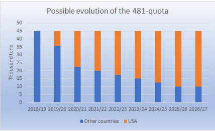 美國與歐盟已經(jīng)就481配額達(dá)成協(xié)議,歐盟初步給美國1.85萬噸的獨(dú)家配額,六年半之后逐步增加到3.5萬噸。481配額總共4.5萬噸,分四個(gè)季度,每季度1.125萬噸,由美國、烏拉圭、阿根廷、澳洲、新西蘭和加拿大分配。協(xié)議生效后,原有國家配額將在2020年上半年先減少9250噸,然后每年減少2500噸,直至2025/26年減少到只剩1萬噸。近幾年烏拉圭和澳洲每年各用掉1.6萬噸481配額,他們的配額將會(huì)大幅減少,阿根廷481配額增長也很迅速,去年達(dá)到6800噸,也會(huì)受到配額減少的影響。