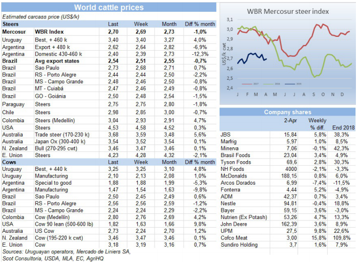 第一季度烏拉圭對(duì)歐盟出口了9535噸冷鮮牛肉,同比增長(zhǎng)1%,因?yàn)橄栴D配額價(jià)格下跌,平均離岸價(jià)跌了4%到9367美金,而冷凍牛肉市場(chǎng)反應(yīng)冷淡,三月出口817噸,第一季度2877噸,同比減少42%,離岸均價(jià)6532美金,同比下跌11%。烏拉圭18/19農(nóng)業(yè)年希爾頓和481配額出口量都有所下降,截止到3月22日,希爾頓配額出口量4905噸,同比減少5.5%,481配額出口9961噸,同比減少13.5%,希爾頓配額離岸均價(jià)跌了9.8%到10628美元,而481配額均價(jià)跌了2.9%到9417美元。