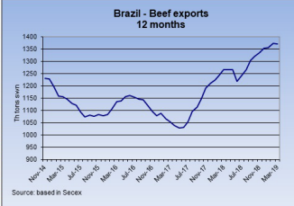 巴西三月份出口牛肉均價(jià)3721美金/噸,自2016年三月以來(lái)最低,另外出口量也比去年低,三月份共出口118523噸牛肉,比二月份多3000噸,但同比減少3000噸,其中一個(gè)原因是今年狂歡節(jié)是三月,而去年是二月。第一季度巴西共出口33.6萬(wàn)噸牛肉,均價(jià)3740,出口量增加5.4%,而均價(jià)跌了8.2%。