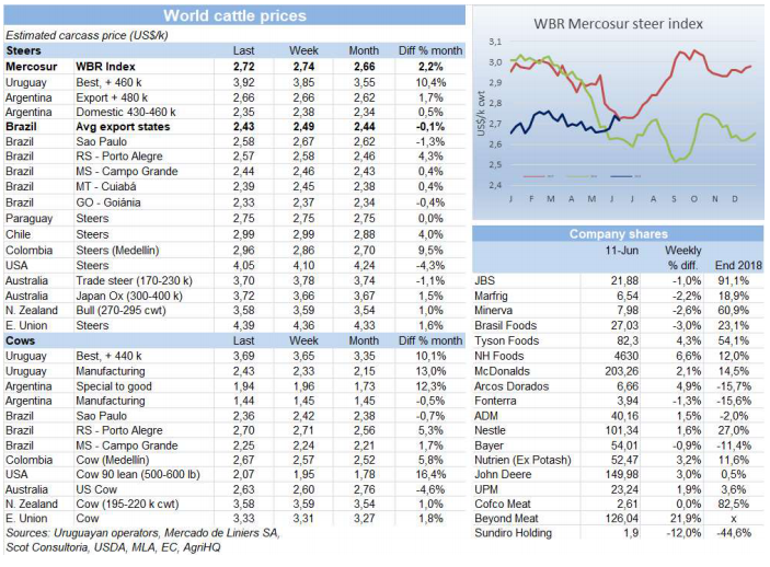 巴西育肥牛價(jià)格大幅下跌,拉低了南方共同市場(chǎng)閹牛價(jià)格,本周南方共同市場(chǎng)閹牛指數(shù)下跌了2美分到2.72美金/公斤,巴西育肥牛供應(yīng)增加,需求端由于中國(guó)市場(chǎng)暫停比較謹(jǐn)慎,有些工廠暫停屠宰,雖然雷亞爾增值0.5%,美金牛價(jià)還是跌了6美分到2.43美金。烏拉圭牛價(jià)又漲了7美分,達(dá)到3.92美金,比第二高巴拉圭的2.75美金還高40%,巴拉圭和阿根廷牛價(jià)沒有變化。