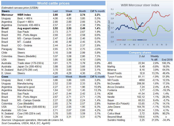 由于巴拉圭價(jià)格疲軟,以及雷亞爾貶值,南方共同市場(chǎng)閹牛價(jià)格本周降低了1美分到2.80美金/公斤。巴西雷亞爾貶值0.5%,本地牛價(jià)的上漲并不足夠抵消貨幣貶值的影響,美金牛價(jià)下跌了1美分到2.52美金,巴拉圭供過(guò)于求,牛價(jià)持續(xù)下跌,本周跌到2.65美金,阿根廷牛價(jià)穩(wěn)定在2.80美金,烏拉圭牛價(jià)還是遠(yuǎn)高于其他國(guó)家,但已經(jīng)停止上漲,特種閹牛價(jià)格4.06美金/公斤。