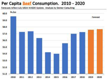 USDA在六月存欄報告出來之后對供應/需求平衡表做了微調(diào),2019年預測牛肉產(chǎn)量調(diào)低了7500萬磅,主要原因是平均胴體重量比預期低,并且第三季度屠宰量也有下行的趨勢。產(chǎn)量的減少會被需求端的調(diào)整抵消一部分,進口量將增加1000萬磅,出口量會減少1000萬磅,此外人均牛肉消費量也被調(diào)低,僅會同比增長0.6%。不過USDA對2020年的預測數(shù)據(jù)并沒有進行調(diào)整,而且雖然牛肉供應量將減少,USDA還是把2019年閹牛價格預測調(diào)低了1.3%。