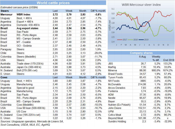上周末起中美貿(mào)易戰(zhàn)重啟,對(duì)南方共同市場(chǎng)各國(guó)貨幣影響很大,拉低了閹牛平均價(jià)格,南方共同市場(chǎng)閹牛價(jià)格跌了7美分到2.72美金/公斤,近八周最低。人民幣貶值到近十年最低水平,影響到了其他國(guó)家的貨幣,比如南方共同市場(chǎng)國(guó)家,中國(guó)是其主要貿(mào)易往來(lái)對(duì)象,人民幣貶值意味著進(jìn)口商購(gòu)買力削弱。雷亞爾貶值4.4%,比索貶值3.4%,雖然巴西和阿根廷本地牛價(jià)幾乎不變,美金牛價(jià)大跌,巴西育肥牛價(jià)格下跌10美分到2.44美金/公斤,阿根廷最好的出口閹牛跌了9美分到2.64美金,巴拉圭和烏拉圭牛價(jià)直接美金結(jié)算,沒(méi)有受到影響,巴拉圭牛價(jià)反而上漲5美分到2.62美金,烏拉圭牛價(jià)保持不變,還在4美金上下。