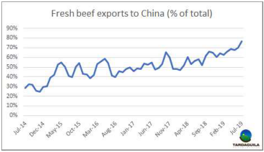 中食展期間的高需求量以及價(jià)格反映在了烏拉圭過(guò)去兩月的出口價(jià)格上,前四個(gè)月出口均價(jià)換算為胴體重量為3727美金/噸,而六七月均價(jià)達(dá)到4110美金,增長(zhǎng)10%。另外中國(guó)市場(chǎng)進(jìn)口量占牛肉產(chǎn)量比例增長(zhǎng),前四個(gè)月占比52%,而六七月是59%。