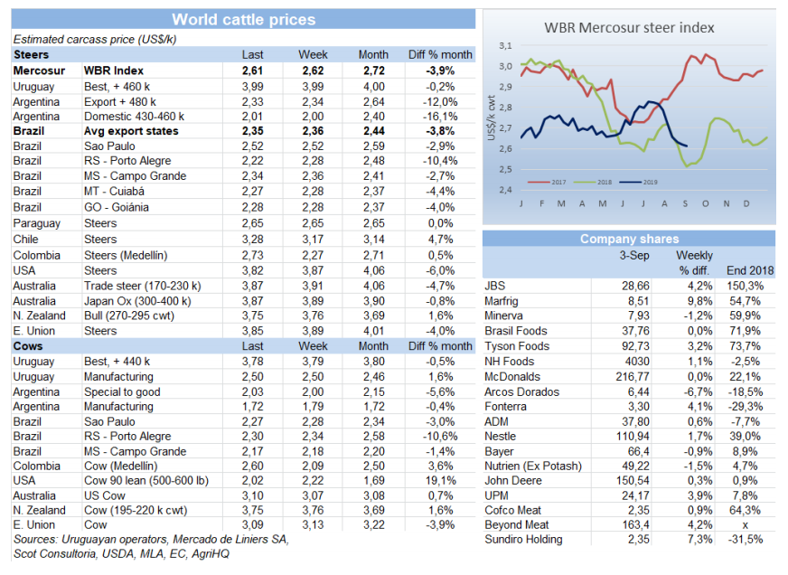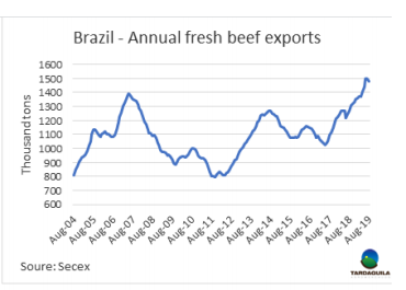 盡管阿根廷經(jīng)濟(jì)狀況微妙且因初選之后一系列情節(jié)變化無(wú)常。這標(biāo)志著相比于執(zhí)政黨,反對(duì)黨候選人Alberto Fernández Cristina和Fernández de Kirchner獲得了明顯偏愛(ài)。目前為止,肉類貿(mào)易鏈未受明顯影響。阿根廷這段時(shí)期經(jīng)歷的危機(jī)中限制購(gòu)買(mǎi)美元這一經(jīng)濟(jì)