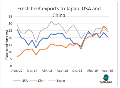 中美貿(mào)易戰(zhàn)的影響還在持續(xù),但本周初中國(guó)市場(chǎng)保持堅(jiān)挺。烏拉圭統(tǒng)牛無(wú)骨件套+帶骨肋排分開(kāi)銷售可以保證整個(gè)牛的銷售,快速提升營(yíng)業(yè)額,省下需求最大的牛骨和牛副。中國(guó)進(jìn)口增長(zhǎng)受水漂市場(chǎng)影響,巴西出口香港前后腱3350美元/噸,牛副價(jià)格更好,價(jià)格與5月食品展時(shí)期相似。非洲豬瘟導(dǎo)致臺(tái)灣需求增長(zhǎng),巴拉圭也從中獲益,前后腱4900美元/噸,牛霖4600美元/噸。