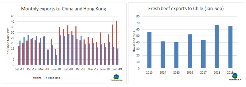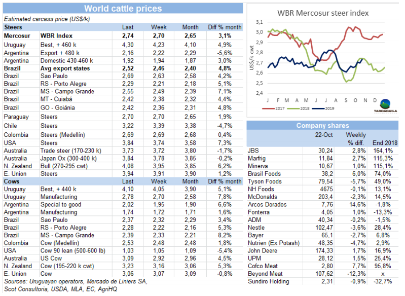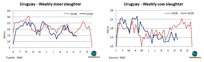 上周牛屠宰量減少是由于草飼牛只短缺和降水引起的裝運困難。烏拉圭肉協(xié)報道,10月19日,被批準(zhǔn)的加工廠牛只屠宰量總計33398頭,比上周減少3379頭,減少了9.2%,比去年同期減少10000頭。在周對比中,母牛屠宰量減少3000頭,減少至12906頭。閹牛屠宰量減少1100頭,幼母牛屠宰量增加818頭,增加至5724頭。屠宰量最大的廠是 Minerv-PUL(3779頭),Las Piedras(3114頭),Marfrig-Colonia(2984頭)。Marfrig四家工廠自前一周起共屠宰10478頭牛,Minerva僅PUL一家廠進(jìn)行屠宰活動。10月截至目前,牛只屠宰量96137頭,比去年同期減少22.8%,考慮到上周因降水造成的延誤,本周屠宰量將有增長。但無論如何10月屠宰量與2018年的20.1萬頭相比將減少3.6-3.8萬頭。這將是2013年以來10月份的最低水平。