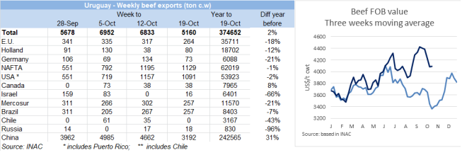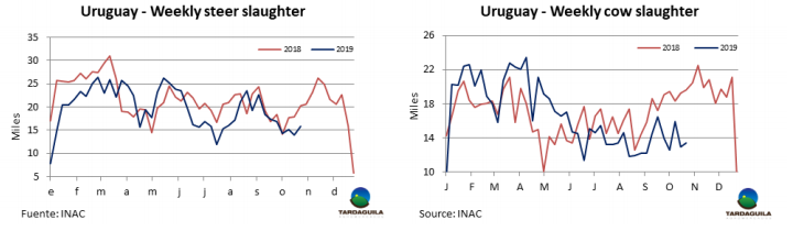 上周牛屠宰量輕度回漲。烏拉圭肉協(xié)報(bào)道。上周牛只屠宰量34563頭,比前一周增長(zhǎng)1165頭,增長(zhǎng)3.5%,比去年同期減少1.2萬頭,去年同期屠宰量4.6萬頭。春季還未完全到來,這為牛只育肥帶來困難。本周屠宰量增長(zhǎng)主要來自閹牛,閹牛屠宰量15792頭。增長(zhǎng)了13%,母牛屠宰量增長(zhǎng)了500頭,增長(zhǎng)至13404頭,幼母牛減少了1000頭,減少至4703頭。屠宰量活動(dòng)最為活躍的廠是 Minerv-PUL(3972頭),Marfrig-Tacuarembo(3349頭),Las Piedras(3246頭)。Marfrig四家工廠共屠宰11097頭牛,屠宰量比上周增加619頭。10月截至26日,牛只屠宰量130700頭,比去年同期減少4萬頭,與去年相比差距繼續(xù)拉大,這將是2013年以來10月份的最低水平。今年截至目前牛只屠宰量184萬頭,比去年減少9.1萬頭。