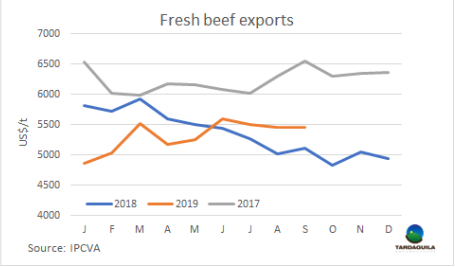 9月冷鮮、冷凍和加工類牛肉出口達(dá)54729噸,價(jià)值約2.98億美元。這些數(shù)字表明了出口量同比增長(zhǎng)61.6%,收益增長(zhǎng)了72.4%,這兩種計(jì)量方式的差異是因?yàn)槌隹趦r(jià)格的上漲,年度增長(zhǎng)6.7%,出口價(jià)格上漲在冷鮮去骨產(chǎn)品和冷凍去骨產(chǎn)品中表現(xiàn)并不均衡。9月去骨冷鮮產(chǎn)品報(bào)價(jià)8700美元/噸,比2018年9月上漲1.5%,冷凍去骨產(chǎn)品達(dá)5000美元/噸離岸價(jià),比去年增長(zhǎng)22.5%。