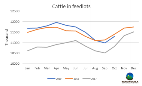 10月美國(guó)農(nóng)業(yè)局牛只存欄報(bào)告沒有巨大變化,10月1日飼育場(chǎng)存欄1130萬頭,比一年前下降1.1%,這是年度對(duì)比中第二個(gè)存欄總數(shù)連續(xù)減少月。9月補(bǔ)欄總計(jì)209萬頭,比2018年高2%,9月賣到市場(chǎng)的牛只共174萬頭,比2018年增長(zhǎng)1%。2019年比去年多一天交易日。8月12個(gè)月平均存欄1160萬頭,存欄量比上兩個(gè)月有輕微下降。