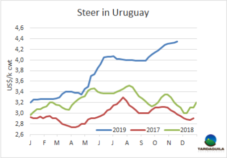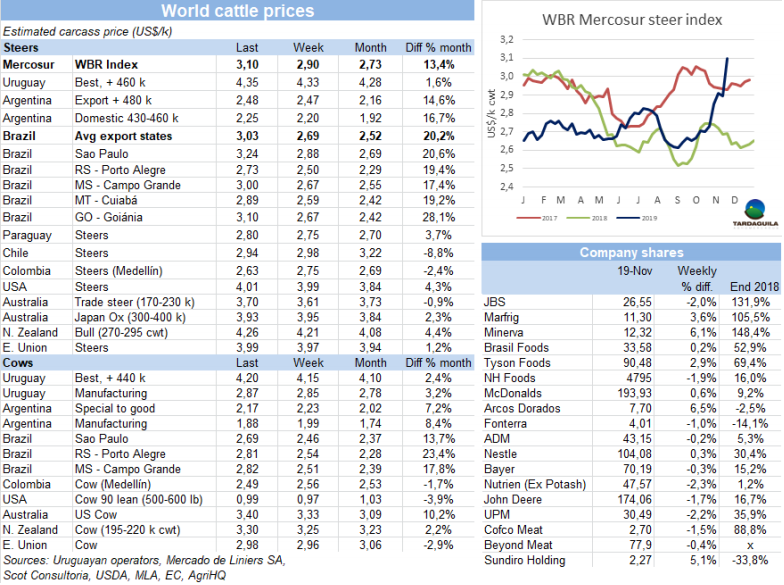 受巴西價格強勢增長影響,南方共同市場閹牛平均價格強勢增長,南方市場閹牛價格指數(shù)本周上漲20美分,上漲至至3.1美元/公斤,達(dá)到自2016年10月三年多以來最高水平。巴西直接出口中國的工廠增加,需求端對相對短缺的供應(yīng)端做出反應(yīng),本周價格按雷亞爾計算增長了13%,按美元計算增長了12.4%,主要的出口州老公牛平均胴體價格3.03美元/公斤,一周內(nèi)增長了34美分。阿根廷情況則不同,出口閹牛價格仍然保持10月末的水平,歐洲需求的減少對價格有一定影響。巴拉圭市場更加穩(wěn)定,胴體價格2.8美元/公斤,達(dá)到3月初至今最高。烏拉圭特種閹牛價格達(dá)歷史最高,胴體價格4.35美元/公斤,在接下來的幾天價格會趨于平緩。