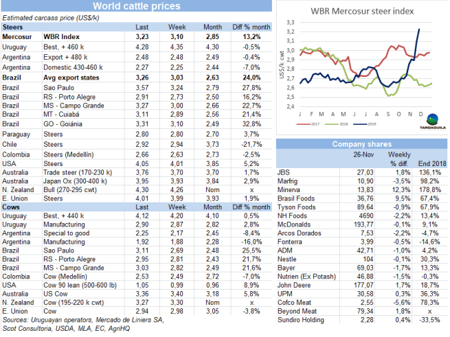 近幾周中國市場價格的繁榮導(dǎo)致埃及進口商失去從主要進口市場(巴西)獲得牛肉產(chǎn)品的機會。盡管有一些進口商前部件套在該市場以CIF價格3400-3500美元/噸成交,其他市場(除中國)前部件套可以達到4500美元/噸。近幾周,埃及為滿足市場需求開始從印度進口水牛肉。最近4周以來,巴西國內(nèi)牛肉市場價格上漲30%,“現(xiàn)在一切陷入了尷尬,我們還沒有迎來12月牛肉價格飛漲的消費旺季?!北M管巴西消費者把消費轉(zhuǎn)向豬肉、雞肉等便宜的動物蛋白,價格仍處于上漲趨勢。