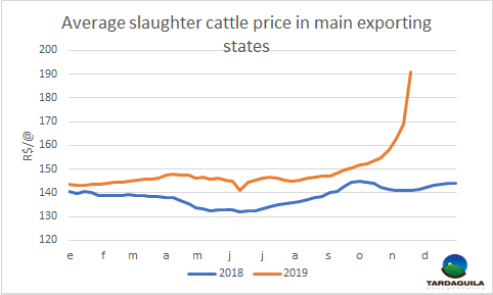 供應(yīng)少量增加,工廠專注2020年歐洲481配額牛肉生產(chǎn),活牛價格出現(xiàn)下行,期貨時間拉長。中國市場的價格下行也對價格有一定影響。特種草飼閹牛胴體價格4.25-4.3美元/公斤,一些工廠出價4.2美元/公斤,目前沒有買到。成年母牛售價4.1美元/公斤,小母牛4.2美元/公斤。市場上昨天成交的期貨14-15天。上周熱浪來襲,巴西南部的一些地區(qū)產(chǎn)生了降水稀少的擔(dān)憂,北部地區(qū)最近有100毫米降水,南部大多數(shù)地區(qū)幾乎沒有降水。近幾周屠宰場將集中481配額牛只的屠宰,草飼牛需求較低,工廠已經(jīng)開始采購配額縮減后的牛只了。預(yù)計12月中旬市場價格將有下行趨勢。