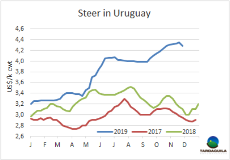 10月閹牛類產(chǎn)品價值1279美元/頭,比上月增長6美元,從7月的1210美元/頭連續(xù)四個月保持上漲趨勢。閹牛類產(chǎn)品價值是指一頭體重480公斤,產(chǎn)出率54%的英國純種閹牛或雜交閹牛產(chǎn)出的所有產(chǎn)品的平均價值的總和。烏拉圭肉協(xié)稱閹牛類產(chǎn)品價值的增長是因為閹牛部位肉出口價值的增長和國內(nèi)市場胴體價格的上漲,部分抵消了牛副和鮮皮價格的下跌。換算成烏拉圭比索,2019年10月閹牛類價值和工廠閹牛采購價格達到自2008年11月11年以來最高。