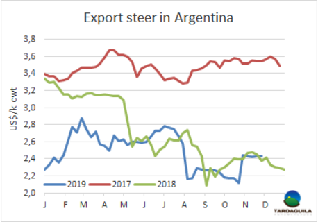 上周,多雨的天氣導(dǎo)致牛只供應(yīng)充足,智利待宰牛的價格有所下降。出口成牛的胴體價格3至-3.10美元,而出口中國的母牛價格為2.7美元。