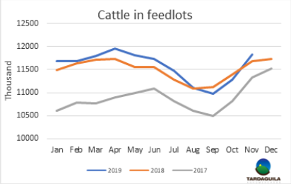 據(jù)美國農(nóng)業(yè)部統(tǒng)計,11月1日,存欄能力1000頭以上的養(yǎng)牛場存欄總量1183.1萬頭,比去年增長1.2%。10月大量補欄和市場低迷使牛只存欄大幅增加。9月和10月的銷售降低導(dǎo)致前端供給增長。10月飼育場187.5萬頭牛只出欄,比一年前減少0.6%,11月根據(jù)屠宰情況推測預(yù)計減少0.4%。