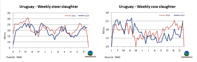 烏拉圭工廠也關(guān)注到中國(guó)市場(chǎng)的下行。巴西現(xiàn)在開(kāi)始將部分出口供應(yīng)轉(zhuǎn)向巴拉圭的關(guān)鍵市場(chǎng),如智利和俄羅斯。智利圣地亞哥1月裝船的巴拉圭全牛20件套5300美元/噸,俄羅斯市場(chǎng)肩胛背肩上周從4100美元/噸下降到3800每元/噸。據(jù)一位業(yè)內(nèi)人士稱(chēng),后部位肉巴拉圭工廠售價(jià)不超過(guò)4300美元/噸,“競(jìng)爭(zhēng)不容易,現(xiàn)在我們還要與活牛價(jià)格走低的巴西競(jìng)爭(zhēng)?!?span>