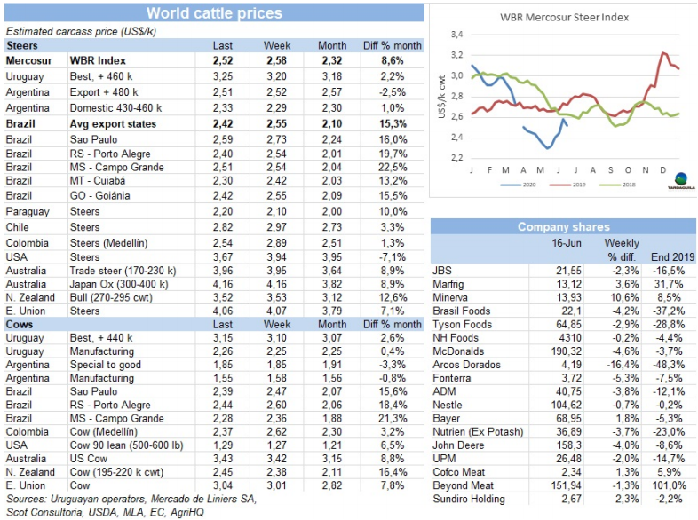 屠宰旺季和歐洲481配額的生產(chǎn)已經(jīng)過去,上周二,Marfrig停止了圣何塞的Inaler廠的屠宰活動(dòng)。知情人士透露,由于牛只供應(yīng)緊缺,而且中國市場(chǎng)正在對(duì)到港的所有集裝箱進(jìn)行新冠病毒檢測(cè),Marfrig集團(tuán)正在研究關(guān)閉北部地區(qū)的工廠:Tacuarembo和Cledinor。Marfrig通常會(huì)在育成牛供應(yīng)較少的冬季間歇關(guān)閉工廠,給員工放假。