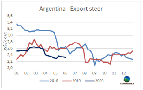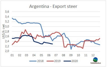 5月閹牛類型價(jià)值降低至1123美元,達(dá)2019年4月至今13個(gè)月以來最低。相反,閹牛采購價(jià)格上漲了52美元,增長至887美元,因此兩者之間的差即工業(yè)附加價(jià)值大幅下降,每屠宰一頭牛的工業(yè)附加價(jià)值下降236美元。烏拉圭肉協(xié)稱閹牛類型價(jià)值降低的原因是所有部位肉價(jià)格都有下降,出口方面,高價(jià)值的部位肉出口至歐洲市場(chǎng)困難導(dǎo)致價(jià)格下跌。國內(nèi)市場(chǎng)胴體、雜碎和副產(chǎn)品的美元價(jià)格也在下跌。閹牛類型價(jià)值是對(duì)一頭重480公斤,產(chǎn)量54%的英國品種閹牛?;螂s交品種的所有產(chǎn)品和副產(chǎn)品的貿(mào)易價(jià)值的加權(quán)平均值。