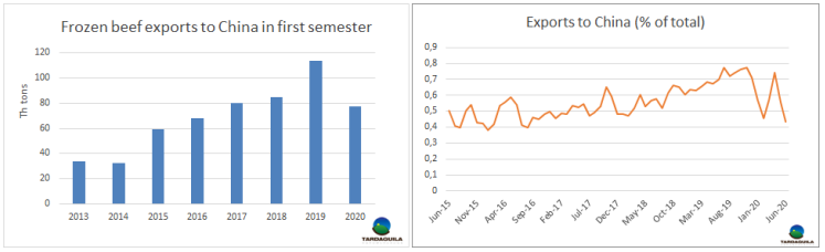 上一季度冰鮮牛肉出口量較冷凍牛肉出口量下降幅度更大,歐洲、巴西、智利等冰鮮牛肉的傳統(tǒng)市場(chǎng)受新冠疫情影響,需求大幅下降。4-6月,烏拉圭冰鮮牛肉出口量6053噸,同比減少36%,冷凍牛肉出口量64420噸,同比減少18%。烏拉圭出口商正在尋找其他替代市場(chǎng)。在過(guò)去的一個(gè)季度,到北美和亞洲的出口量顯著增加。出口至北美市場(chǎng)898噸,是2019年同期338噸的兩倍多。到亞洲出口量增加了近150%,達(dá)814噸,其中出口至日本566噸,出口至中國(guó)248噸。過(guò)去兩個(gè)月,冰鮮牛肉到中國(guó)出口量已經(jīng)從很少增長(zhǎng)至每月5柜。本季度出口到中國(guó)的冰鮮牛肉平均價(jià)格5685美元/噸,而冷凍牛肉平均價(jià)格為4561美元/噸。