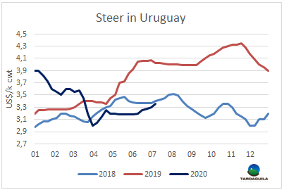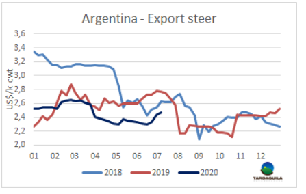 一位貿(mào)易商總結(jié),“現(xiàn)在市場(chǎng)有所好轉(zhuǎn)”。部分原因是中國(guó)市場(chǎng)開(kāi)始回暖,尤其是一些部位肉的價(jià)格有所上漲,盡管他強(qiáng)調(diào)仍存在一些投機(jī)的貿(mào)易。未來(lái)我們將看到價(jià)格是否可以保持,是上漲一些還是回到一周之前的水平。中國(guó)市場(chǎng)很亂,有客戶考慮到目前的狀況仍想出低價(jià),而另一些人認(rèn)為后面幾個(gè)月會(huì)漲價(jià)已經(jīng)以高一些的價(jià)格確認(rèn)。牛肉價(jià)格上漲受到豬價(jià)上漲的拉動(dòng),其他肉類(lèi)也是如此。中國(guó)白條價(jià)格連續(xù)7周上漲至3.4美元/公斤,較五月下旬低點(diǎn)上漲了35%。一位貿(mào)易商強(qiáng)調(diào),烏拉圭對(duì)疫情的控制相對(duì)較好,對(duì)進(jìn)口商來(lái)講比較穩(wěn)定,與阿根廷和巴西正在經(jīng)歷的情況大相徑庭,對(duì)于要提前付預(yù)付的進(jìn)口商來(lái)說(shuō)非常重要。阿根廷統(tǒng)牛六切報(bào)價(jià)范圍在3950-4100較上周上漲了200-300美元/噸。巴西工廠也表示中國(guó)市場(chǎng)有所好轉(zhuǎn),香港漂貨市場(chǎng)前后腱成交價(jià)4000美元/噸,從上周開(kāi)始出口市場(chǎng)更活躍了。一位出口商強(qiáng)調(diào),收到的牛副還價(jià)很低,都是一些不可能成交的價(jià)格。
