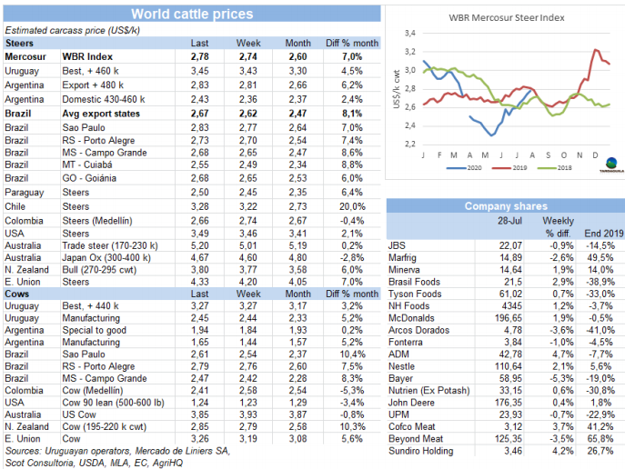 本周南美國(guó)家待宰牛價(jià)格上漲,上漲趨勢(shì)受到密切關(guān)注。南方共同市場(chǎng)閹牛價(jià)格指數(shù)上漲4美分,至2.78美元/公斤,達(dá)三月上半月新冠疫情在南美地區(qū)爆發(fā)以來新高。較五月中旬牛價(jià)低點(diǎn)時(shí)上漲了48美分,上漲了21%。巴西,按本地雷亞爾計(jì)的成交價(jià)再次上漲。本周美元在全國(guó)范圍內(nèi)下跌,而巴西雷亞爾升值1.2%。巴西主要出口周育成牛價(jià)格上漲5美分,上漲至2.67美元/公斤。巴拉圭由于在口蹄疫接種階段活牛供應(yīng)量少,價(jià)格保持上漲趨勢(shì)。阿根廷和烏拉圭活牛參考價(jià)本周上漲2美分,分別上漲至2.83美元/公斤和3.45美元/公斤。烏拉圭目前已經(jīng)看到價(jià)格上漲趨勢(shì)將在本季度后停止。