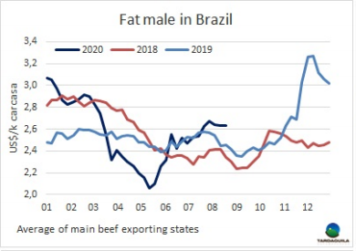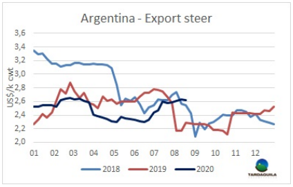 盡管今年這個(gè)時(shí)候草飼牛的供應(yīng)接近為零,需求端仍集中精力在為481配額生產(chǎn),對(duì)其他類型的牛興趣極低。因此參考價(jià)再次下調(diào),預(yù)定期限拉長(zhǎng),大多數(shù)是九月第二周,配額生產(chǎn)快要完成的時(shí)候。有一些工廠不還價(jià),另一些還價(jià)水平在閹牛3.3美元/公斤,母牛3.1美元/公斤,一些成交價(jià)比該參考價(jià)高一些,閹牛成交在3.35美元/公斤,母牛成交在3.15-3.2美元/公斤。今年疫情最嚴(yán)重的時(shí)候出現(xiàn)了特殊的情況,人們對(duì)體重輕的閹牛和國(guó)內(nèi)市場(chǎng)小母牛更感興趣,它們的價(jià)格與體重較重的牛相當(dāng),甚至略高,預(yù)定時(shí)間也可能更短。烏拉圭多個(gè)地區(qū),特別是北部地區(qū),人們對(duì)降水狀況越來(lái)越擔(dān)心,北部地區(qū)幾個(gè)月來(lái)沒(méi)有明顯的降雨記錄。預(yù)計(jì)從今天到周五還會(huì)有一股寒潮,伴有嚴(yán)重霜凍,甚至可能出現(xiàn)降雪。預(yù)計(jì)牛價(jià)的下行壓力將至少持續(xù)到9月初。工廠已經(jīng)訂購(gòu)了配額開(kāi)始完成的牛,因此,至少到那時(shí)候,預(yù)計(jì)不會(huì)出現(xiàn)根本的變化。