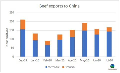 七月南美和澳洲兩個(gè)主要供應(yīng)地區(qū)對(duì)中國(guó)的牛肉出口再次增長(zhǎng),由于南美市場(chǎng)出口量的增加,部分抵消了澳大利亞和新西蘭的出口量減少。來(lái)自阿根廷的評(píng)估數(shù)據(jù)表明(數(shù)據(jù)將于本月底公布),南方共同市場(chǎng)7月向中國(guó)出口牛肉14.4萬(wàn)噸,比6月增長(zhǎng)了1.7萬(wàn)噸。相反,從澳洲發(fā)運(yùn)量減少了7000噸減少至2.3萬(wàn)噸。今年截止7月,南美和澳洲向中國(guó)出口牛肉102萬(wàn)噸。