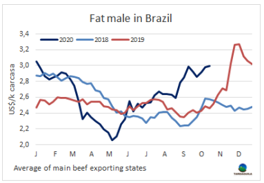 屠宰工廠為出口中國準備的牛的活牛支付高價的階段已經基本過去了,能滿足春節(jié)需求的船期大多數都在十一月中旬,很明顯很多出口商已經完成銷售。圣保羅育成牛成交價261-265雷亞爾/15公斤,較上周上漲了3雷亞爾/15公斤。本周初市場較為平靜,可能是由于預期國內需求將在本月下半月趨于平靜。盡管大部分地區(qū)牛家有所上漲,但米內羅三角和戈亞尼亞等地區(qū)的牛價上周沒有發(fā)生變化。