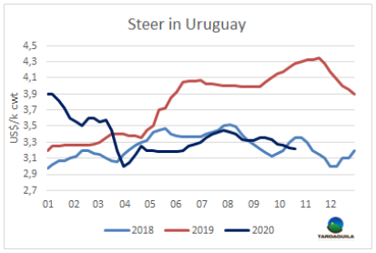 在過去的一年里,由于激進的需求推動牛價上漲,因此,通過在飼養(yǎng)方面的更大投資,加速了動物屠宰速度,待宰閹牛牛齡大幅下降。根據國家肉類研究所(INAC)的數據,在截止8月的12個月中,合規(guī)屠宰場活牛屠宰量91.5萬頭。較上個12個月相比(截至2019年8月),大幅下降,減少了12.5萬頭,降幅為12%。但并非所有類別都出現(xiàn)了下降,那6顆齒和滿齒的牛的屠宰量下跌,被2-4顆齒的牛屠宰量增長所抵消。今年截至八月2-4顆齒閹牛屠宰量44.3萬頭,較前12個月增長了10%,6顆齒活牛屠宰量下降了26%,下降至15.5萬頭。滿齒活牛屠宰量下降了35%,下降至22.8萬頭。因此,最低牛齡的類別占屠宰總量的48.4%。造成這一趨勢的原因毫無疑問與補欄和育肥進程中的投資加大有關。這并不是偶然的,因為這個國家有最大的永久牧場和每年的飼料作物。根據畜牧部的數據,共有180萬公頃的天然牧場土地,至少是本世紀迄今為止最大面積。與此同時,飼養(yǎng)場的投資得以維持。盡管全球屠宰量有所減少,但今年到目前為止,出欄總數與去年非常相近。絕大多數是2-4顆齒的牛和小母牛。