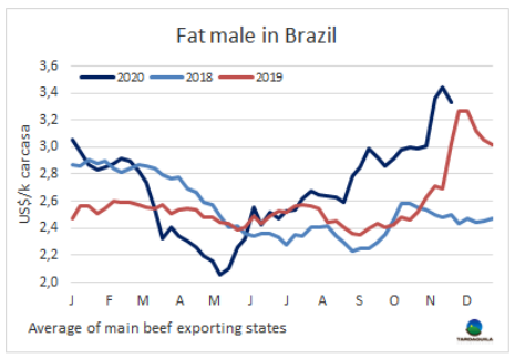 本周烏拉圭育成閹牛價(jià)格達(dá)南美地區(qū)最低,這是近十年來(lái)鮮有發(fā)生的,也是2017年四月以來(lái)第一次達(dá)本地區(qū)最低。本周烏拉圭特種出口閹牛成交價(jià)2.85美元/公斤,低于阿根廷的出口閹牛成交價(jià)2.92美元/公斤和巴拉圭的胴體成交價(jià)2.95美元/公斤。巴西牛價(jià)仍明顯高于其他地區(qū),盡管上漲的趨勢(shì)有所停頓,上周開(kāi)始牛價(jià)走勢(shì)下行調(diào)整,巴西主要出口州育肥牛平均價(jià)格下降了11美分,下降至3.33美元/公斤。南方共同市場(chǎng)閹牛價(jià)格指數(shù)本周下降了7美分,下降至3.15美元/公斤。