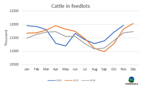 盡管歐洲需求下降,中國(guó)市場(chǎng)不順暢,近一個(gè)月用于出口的活牛價(jià)格仍然強(qiáng)勢(shì)上漲。近五周閹牛價(jià)格上漲了13%。一些分析人士觀察到,原因之一可能是通常在年底之前出于稅收便利的原因,飼育場(chǎng)往往將銷售推遲到第二年。另一方面是飼育場(chǎng)供應(yīng)問(wèn)題。許多飼養(yǎng)場(chǎng)把育肥到一半的牛送回,以便將育肥階段拉長(zhǎng),以獲得更好的價(jià)格;目前的價(jià)格增長(zhǎng)還不夠,育肥的損失仍然很大,所以他們?cè)噲D將銷售延后到圣誕節(jié)前后。
