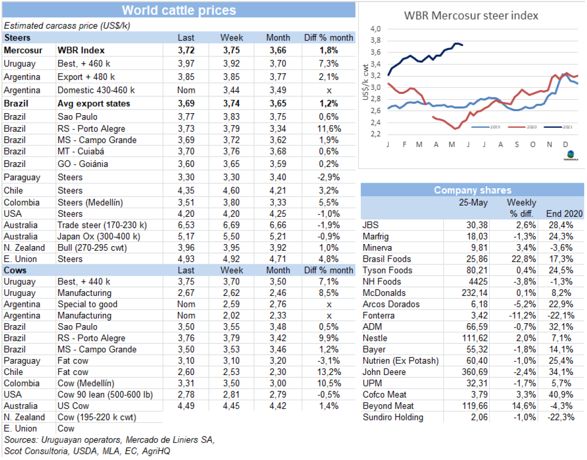 Minerva在烏拉圭3家工廠中的兩個(gè),Pulsa(7廠)和Carrasco(3廠)再次獲批可以對美國出口鮮肉。此前美國農(nóng)業(yè)部/FSIS衛(wèi)生當(dāng)局制定暫停對美出口措施,自2020年8月至9月生效。從那時(shí)起,為迅速恢復(fù)商業(yè)聯(lián)系,兩國衛(wèi)生部門之間開始信息和文件交流。預(yù)計(jì)在2020年底收到的恢復(fù)消息終于于今年五月20日收悉。