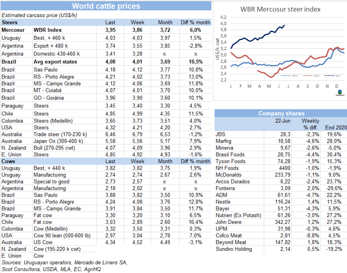 在巴西貨幣政策委員會(huì)上周公布會(huì)議記錄后,美元匯率突破了5雷亞爾的下限,并承認(rèn)基準(zhǔn)利率可能會(huì)以更高的速度上調(diào)。盡管巴西育肥牛的雷亞爾價(jià)格較上周幾乎保持不變,雷亞爾匯率上升1.5%使美元牛價(jià)增長(zhǎng)了7美分至4.08美元/公斤,達(dá)2011年以來(lái)最高。阿根廷方面,英國(guó)純種閹牛上周價(jià)格反彈,美元價(jià)格上臟19美分至3.74美元/公斤,包含出口稅。巴拉圭待宰牛價(jià)格上漲了5美分至3.45美元/公斤。烏拉圭市場(chǎng)堅(jiān)挺,參考價(jià)格保持不變,特種閹牛4-4.05美元/公斤。南方工體歐諾個(gè)市場(chǎng)閹牛價(jià)格指數(shù)較上周增長(zhǎng)了9美分至3.95美元/公斤。