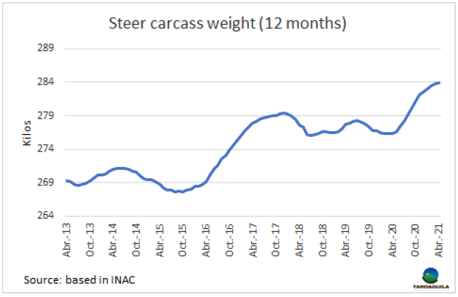 由于出口市場(chǎng)為體重較大的閹牛售價(jià)可觀,閹牛平均胴體重量持續(xù)增長(zhǎng)。截止4月烏拉圭肉協(xié)最近一次發(fā)布的數(shù)據(jù)前的12個(gè)月內(nèi)閹牛平均體重283.9公斤,創(chuàng)新紀(jì)錄。截止2020年4月的12個(gè)月內(nèi)閹牛平均體重276.3公斤,今年4月的平均體重增長(zhǎng)了7.6公斤。牛肉行業(yè)中體重較大的閹??梢再I上更好的價(jià)錢,因此生產(chǎn)者對(duì)此做出反應(yīng)。在胴體重量上上烏拉圭仍需繼續(xù)努力,在美國(guó)等發(fā)達(dá)國(guó)家的牛只平均體重更重一些。澳大利亞的公牛和母牛體重繼續(xù)創(chuàng)新紀(jì)錄,第一季度的體重紀(jì)錄分別為341公斤和281公斤。烏拉圭的閹牛體重比澳大利亞輕57公斤,母牛均重較澳大利亞輕45公斤。