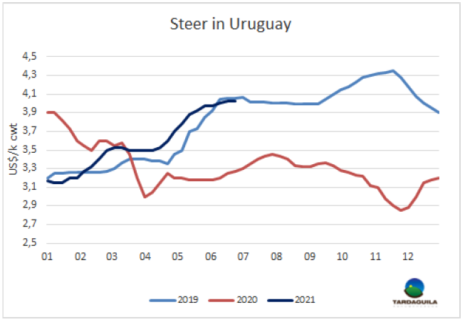 2020年七月至2021年六月,烏拉圭牛屠宰量229萬(wàn)頭,較上年增長(zhǎng)了31萬(wàn)頭,增長(zhǎng)率15.7%。逆轉(zhuǎn)了前一年15.8%的大幅下降。烏拉圭牛肉屠宰量在2019/20年僅不足200萬(wàn)頭,是六年來(lái)的最低水平,但屠宰量迅速?gòu)?fù)蘇,因?yàn)檫@種下降的原因不是周期性的保留種群,而是活牛供應(yīng)的減少尤其是閹牛。2017年和2018年大量出口活牛。當(dāng)2018年出生的下一代開(kāi)始達(dá)到屠宰重量時(shí),屠宰量很快就恢復(fù)了。由于平均體重增長(zhǎng),牛肉產(chǎn)量的增長(zhǎng)將超過(guò)屠宰量的上漲。據(jù)估算,到2020年7月至 2021年6月,烏拉圭牛肉產(chǎn)量將達(dá)59.3萬(wàn)噸,年增長(zhǎng)超過(guò)9萬(wàn)噸,增長(zhǎng)率18.2%。達(dá)在過(guò)去九年里是第二高屠宰量, 2016/17年牛屠宰量超240萬(wàn)頭,牛肉產(chǎn)量60.7萬(wàn)噸。當(dāng)時(shí)的平均胴體重量為251.9公斤,而今年的胴體均重估計(jì)為259.3公斤,達(dá)歷史最高。