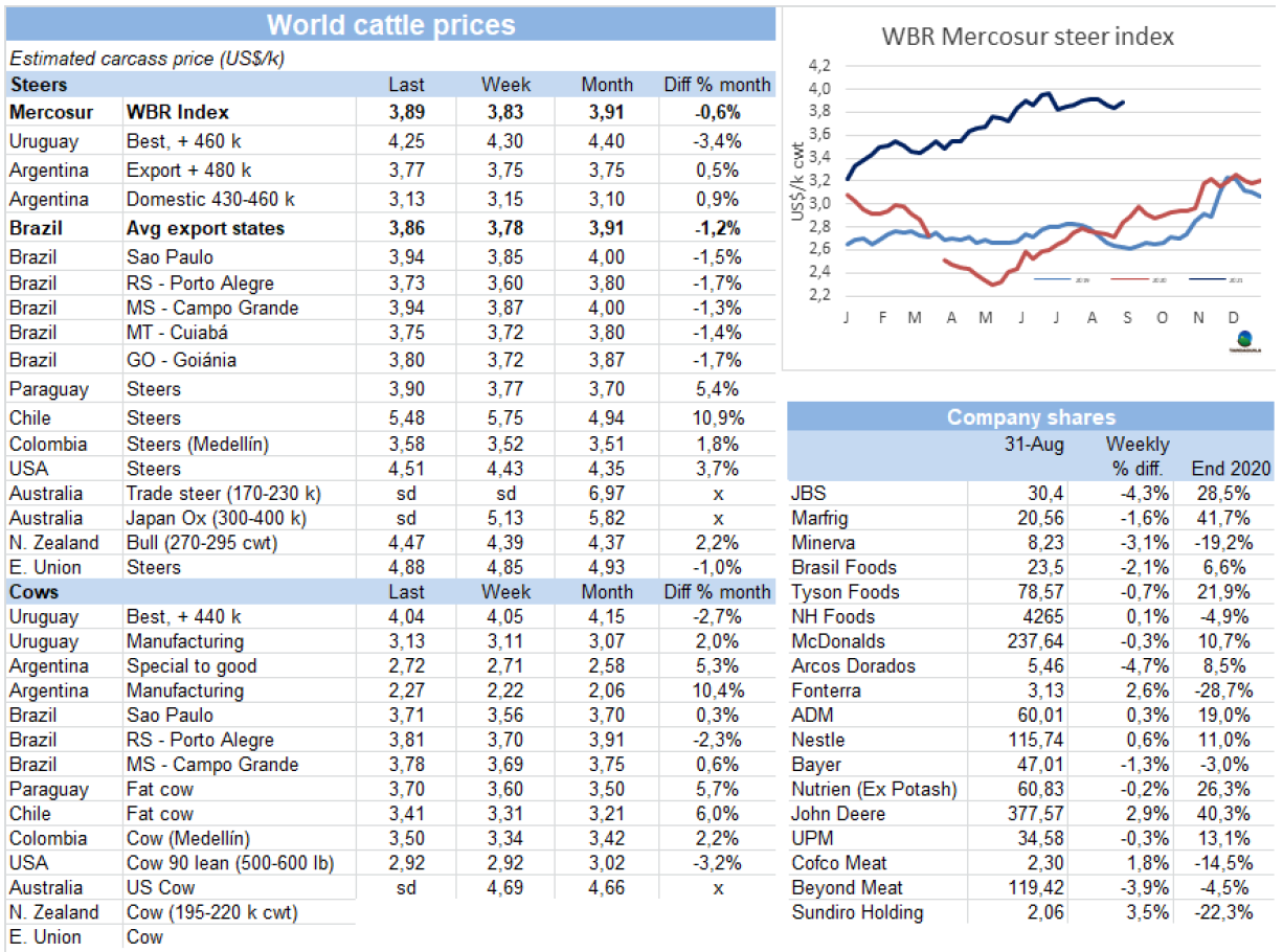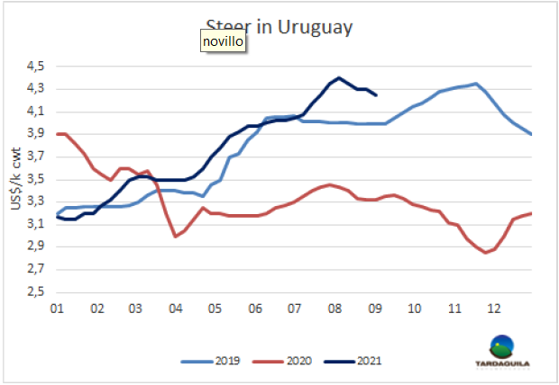 自8月初價格達(dá)歷史最高水平以來,育肥牛市場一直保持著溫和的下跌趨勢。一方面,有些人認(rèn)為供應(yīng)略有增多,另一方面,需求端非常關(guān)心是否可以找到集裝箱把已完成的產(chǎn)量運(yùn)走。有工廠稱未來幾天甚至幾周由于裝運(yùn)延誤可能將被迫減產(chǎn)。美麗華決定可能從下周中旬開始停止在3廠的生產(chǎn),并讓員工休假直到10月初。Marfrig還在評估暫停55廠的屠宰活動,可能在未來幾小時內(nèi)做出決定。目前的裝運(yùn)除了通過蒙得維的亞港以外,也在尋求其他港口,但這并不容易,南美地區(qū)乃至世界上所有港口都有同樣的問題。有些工廠預(yù)定了3-4周后的牛,但還沒有采購;還有一些工廠預(yù)定一周之內(nèi)交貨的牛,母牛的需求量大于閹牛。特種閹牛價格大多是每公斤4.25美元,有幾頭超過了4.20美元,偶爾也有4.3美元的交易。對于母牛來說,體重較重的一般支付4.00-4.05美元,體重較低的最高可達(dá)4.10美元。人們預(yù)計,市場將繼續(xù)緩慢下滑,特別是在物流問題無法解決的情況下。育肥牛市場保持下行趨勢,或?qū)⒊掷m(xù)數(shù)周。據(jù)被問詢的市場參與者反映,大多數(shù)工廠備貨充足,期貨采購時間拉長,有些工廠甚至開始買九月前10天的牛。這種情況下工廠壓價幾美分,只要生產(chǎn)者可以接受,價格會繼續(xù)下跌。本周用于出口的特種閹牛參考價4.3美元/公斤,國內(nèi)市場的閹牛參考價4.25美元/公斤,肉母牛4.05-4.15美元/公斤,牛供應(yīng)量仍很少,預(yù)計15天之后隨著天氣變化和烏拉圭南部的降雨來臨活牛供應(yīng)將增加。